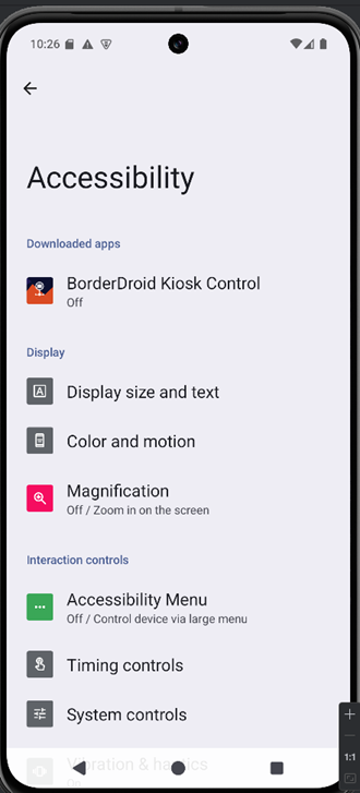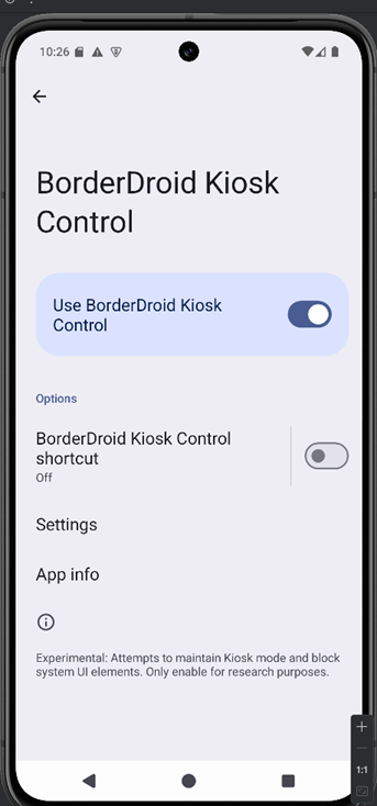 When the app launches, it shows a setup screen with options for display settings, interaction controls, and kiosk control. Kiosk mode is a lockdown mode that prevents users from exiting the current app, changing settings, or accessing other parts of the system. It usually means the app can lock itself into the foreground, blocking the home button, recent apps, or notifications. This ensures the user can’t minimize or close the app without proper authorization (like a PIN).