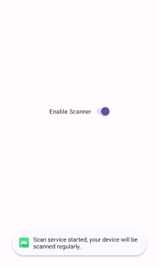 When I launched the application, it displayed a simple interface with a single toggle labeled “Enable Scanner.” Activating the toggle starts the scanning service, which cannot be stopped. As the app provides no additional user interaction, I proceeded to analyze the source code for further insights.