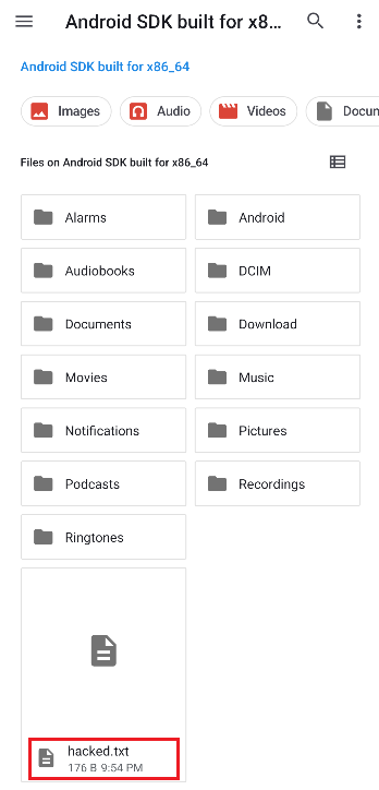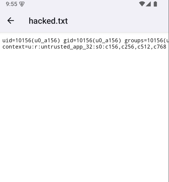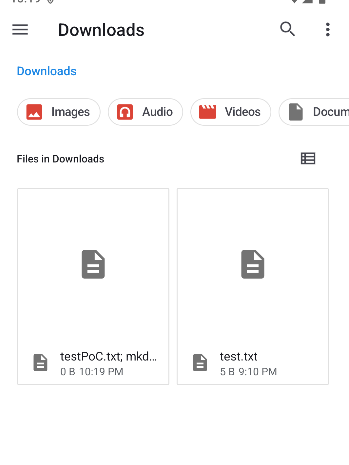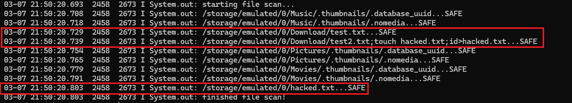 emu64x:/sdcard/Download # mv test2.txt "test2.txt;touch hacked.txt;id>hacked.txt"