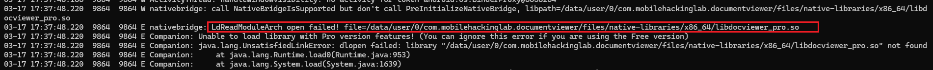 We have placed the libdocviewer_pro.so file under the /data/data/com.mobilehackinglab.documentviewer/files/native-libraries/x86_64 directory.