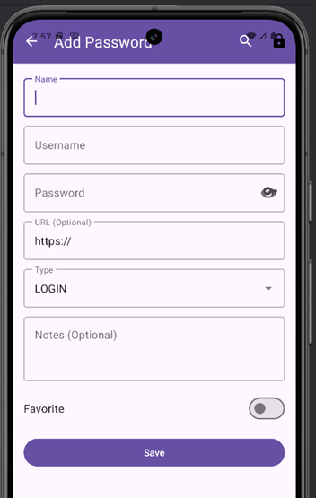 After unlocking the app, you can add a new password entry by providing details such as the name, username, password, URL, and notes, then saving the entry.