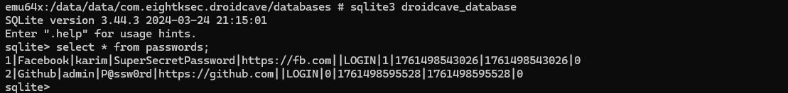 Uri uri = Uri.parse("content://com.eightksec.droidcave.provider/execute_sql/SELECT%20*%20FROM%20passwords"); // SELECT * FROM passwords;