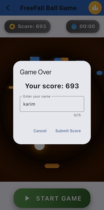 The player’s name and score are saved in a SQLite database file named freefallgame.db, located in the app’s Documents directory.