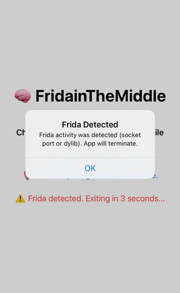 When you launch the app on a jailbroken device with the Frida server running, the app detects Frida, displays an alert, and then closes after 3 seconds.