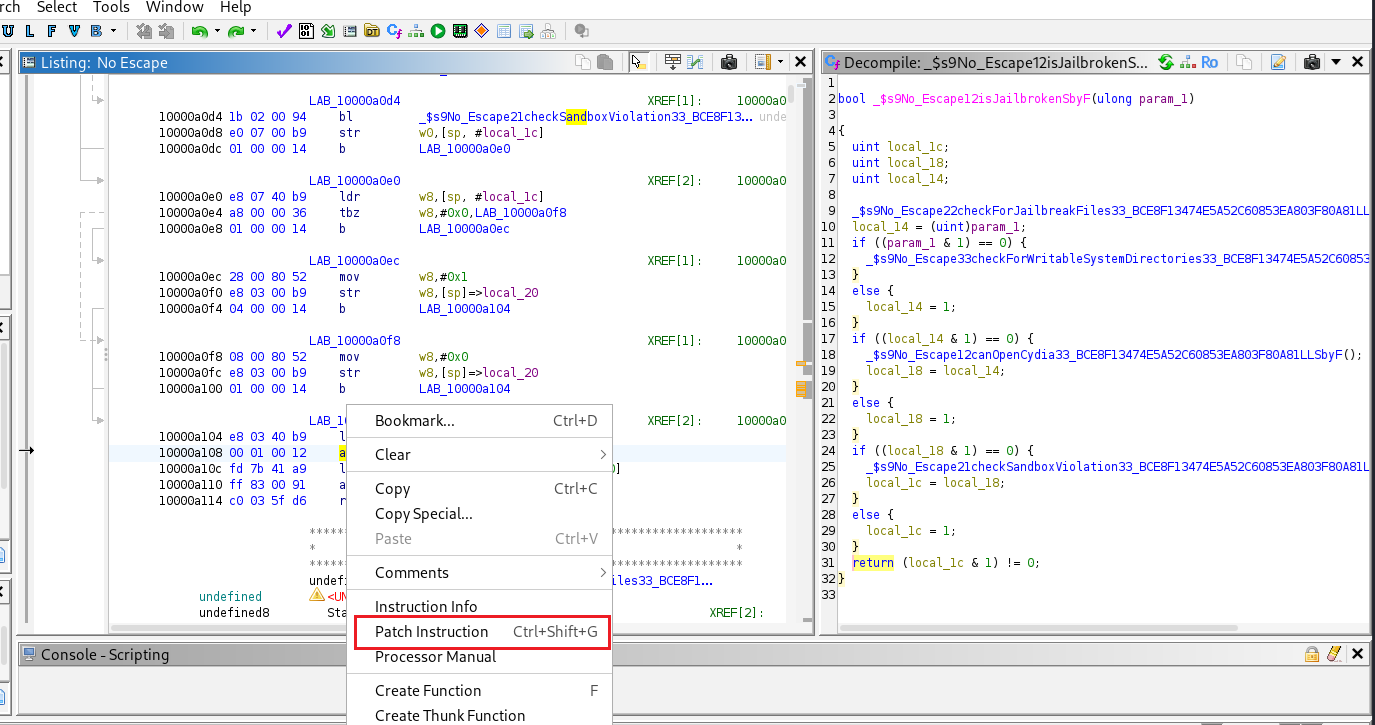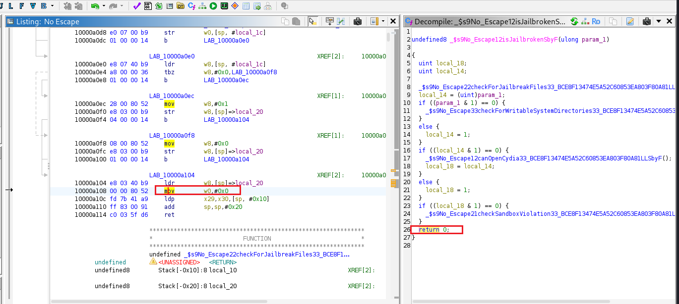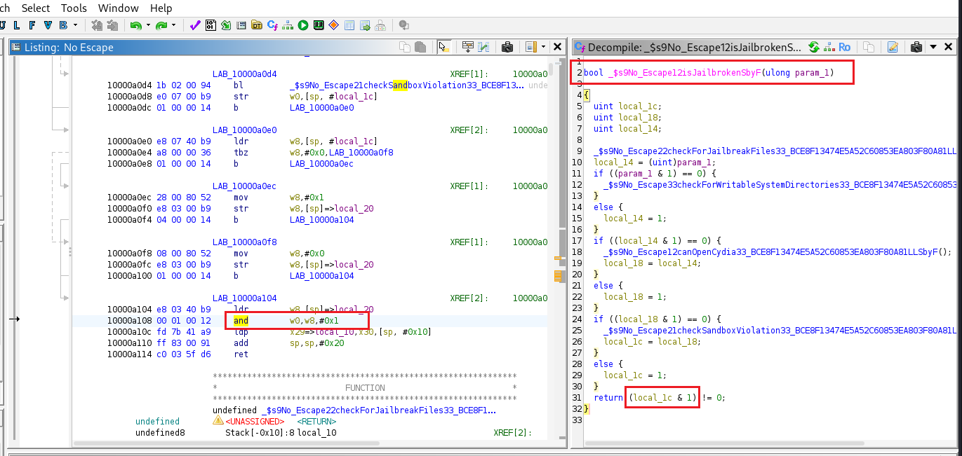 [iOS Device::com.mobilehackinglab.No-Escape ]-> [*] Called function: $s9No_Escape12isJailbrokenSbyF