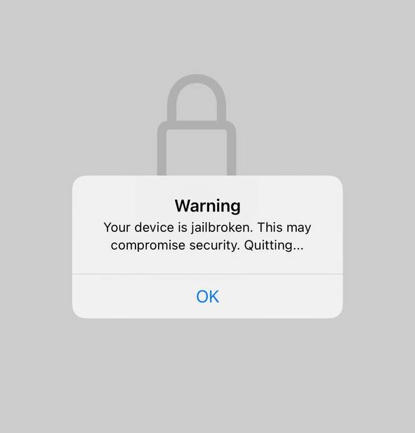 On launch, the app instantly flags the device as jailbroken and terminates.