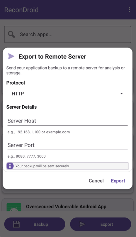 When the Export button is clicked, the user should select the protocol (http or https) and specify the server’s IP address and port. The app then uploads the backup file to that server using a POST /upload request