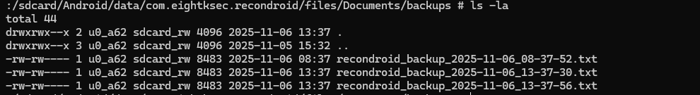 When the Backup button is pressed, the app writes a backup file to /sdcard/Android/data/com.eightksec.recondroid/files/Documents/backups