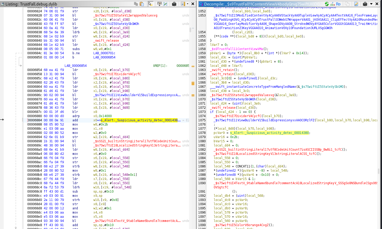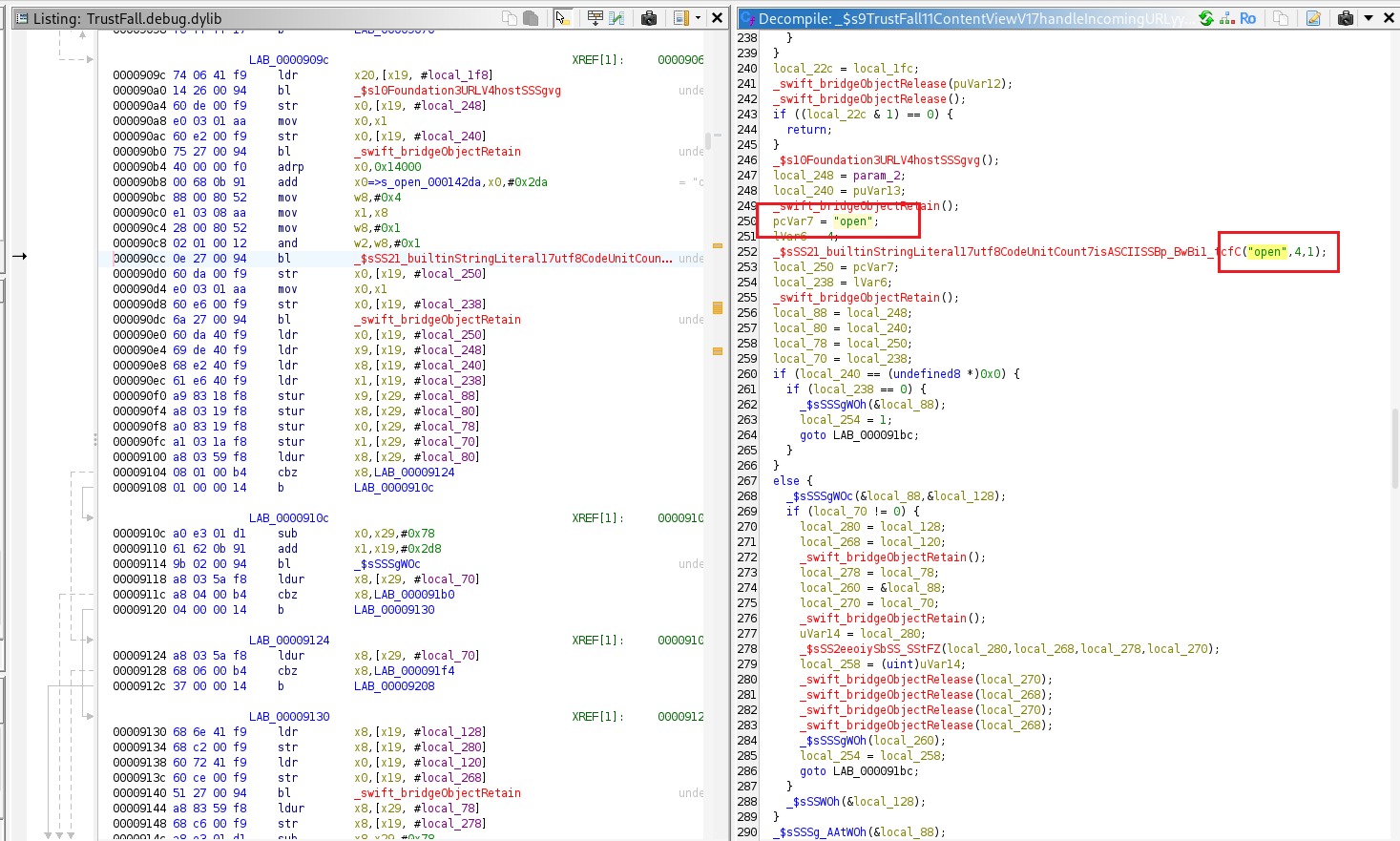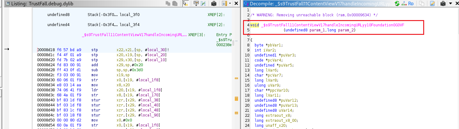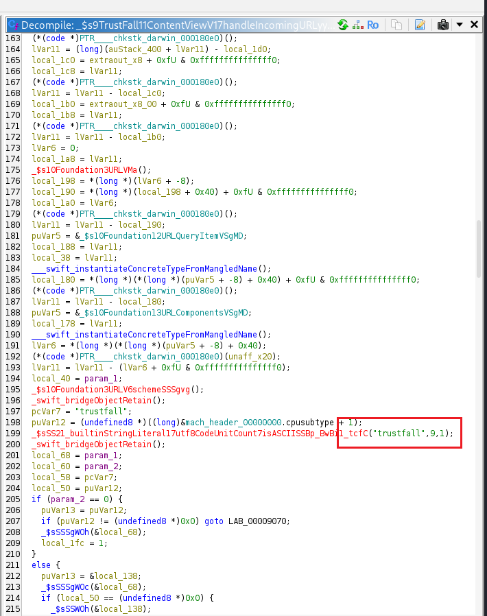 the function _$s9TrustFall11ContentViewV17handleIncomingURLyy10Foundation0G0VF When demangled, this becomes: