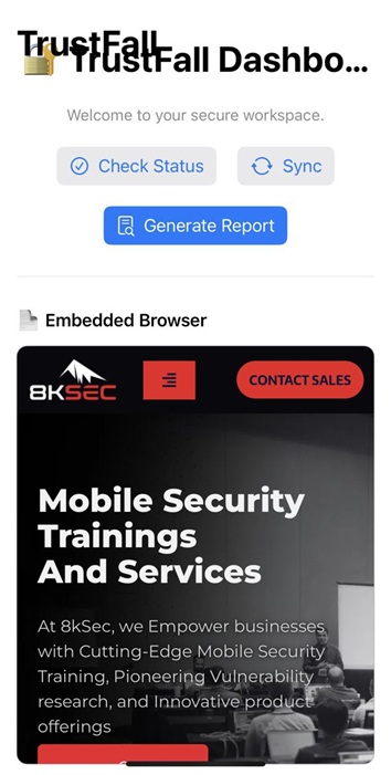 If you open the deeplink trustfall://open?url=https://8ksec.io, the app will load the https://8ksec.io website within its embedded browser.