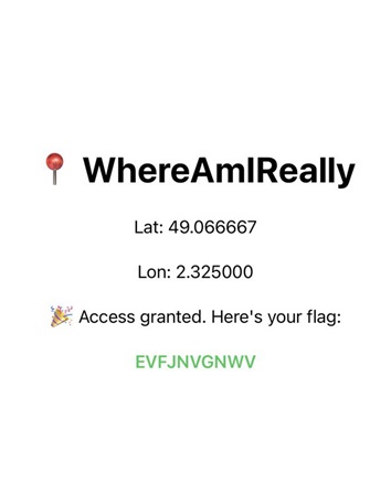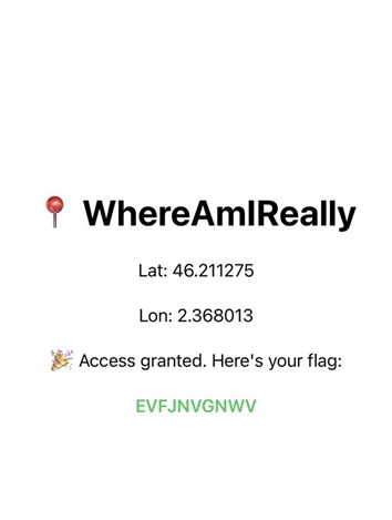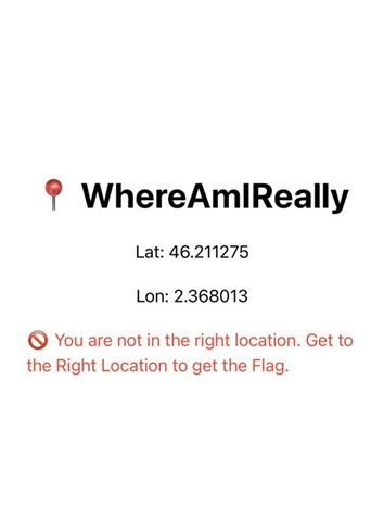 WhereAmIReally is an iOS app that only reveals the flag if you’re in the right place “physically”. It checks your GPS coordinates against a geofenced area and validates the authenticity of your location before granting access. But this app doesn’t just trust what you feed it. It has some additional checks in place.