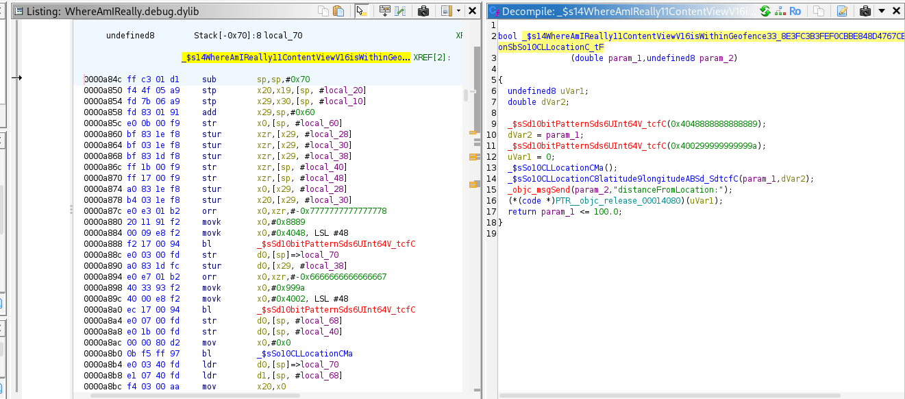 the function at offset 0xa84c compares our location to Latitude: 49.06666666666667, Longitude: 2.325 and returns true if the distance is ≤ 100, otherwise false. We need to hook it and force the return value to true.