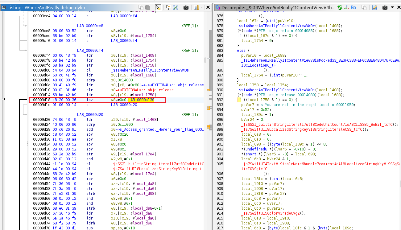 We should patch the instruction tbz w8, #0x0, LAB_0000a130 and replace it with a NOP so execution continues to the next instruction b LAB_00009d20, which is the flag branch.